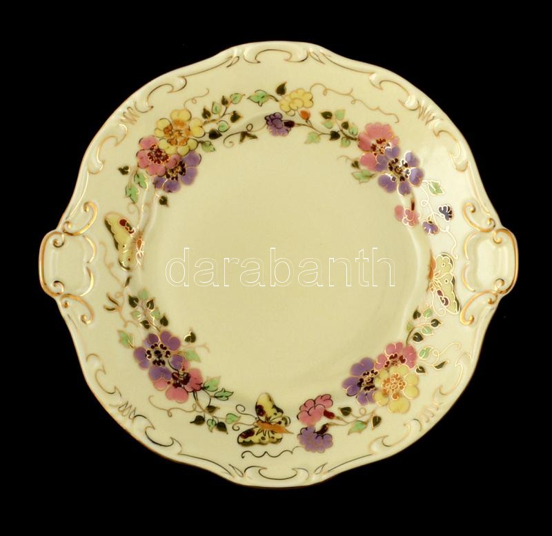 Beschreibung: Zsolnay pillangó mintás süteményes készlet, kézzel festett, jelzett, hibátlan, d: 16,5 cm (6×), 25,5×24 cm
