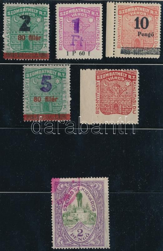 Beschreibung: 5 db Szombathely városi és 1 db Szeged városi illetékbélyeg