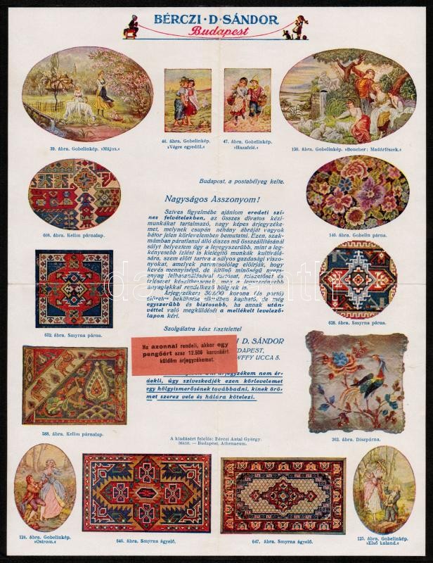 cca 1927 Budapest, Bérczi D. Sándor szőnyeg és goblein áruházának rekl... https://www.darabanth.com/de/294-Fernauktion/294.0/Andere-Sammelgebiete/Werbungen~200020/cca-1927-Budapest-Berczi-D-Sandor-szonyeg-es-goblein-aruhazanak-reklamlapja-28-5x22-cm~II1557599