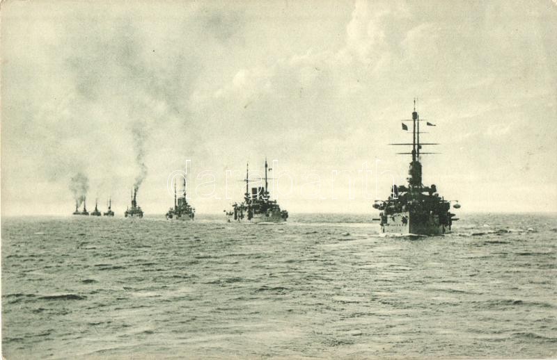 Eskadre manöviert auf hoher See / K.u.K. hajóraj manőverezése a tengeren Polánál / Austro-Hungarian Navy, K.u.K. Kriegsmarine squadron, Phot. A. Beer, Verlag F. W. Schrinner, Pola 1910. (EK)