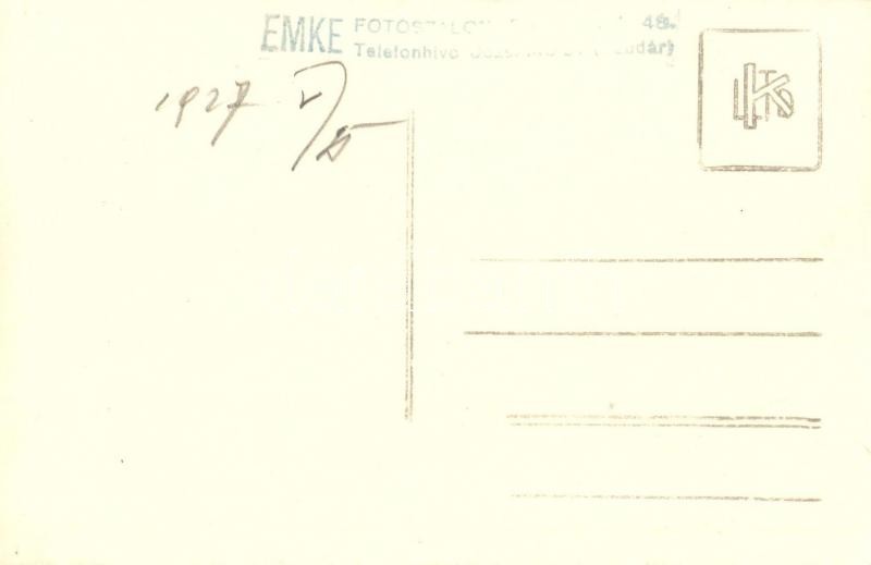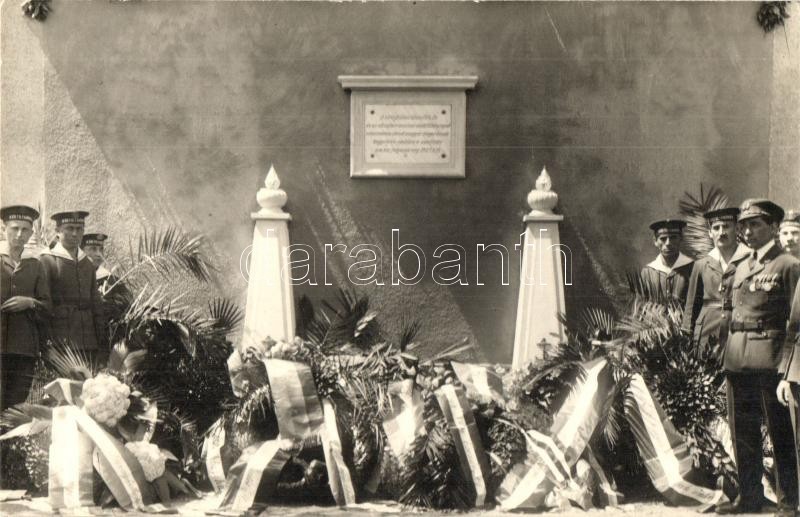 Magyar királyi folyamőrség tagjai az 1927-es megkoszorúzott tengerészeti hősi emlékmű előtt / Hungarian river guards in front of a Naval heroes monument, Emke photo