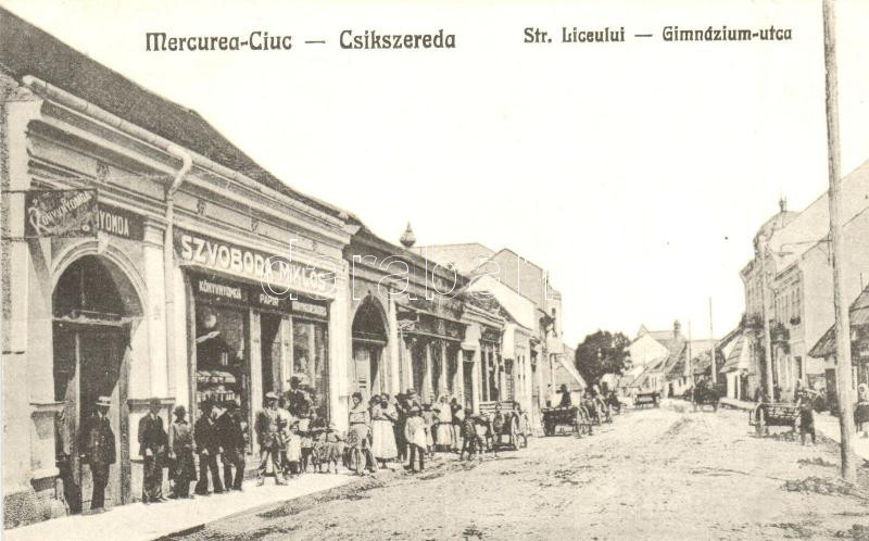 Beschreibung: Csíkszereda, Miercurea Ciuc; Gimnázium utca, Szvoboda Miklós könyvnyomdája és saját kiadása / Str. Liceului / street view, book shop
