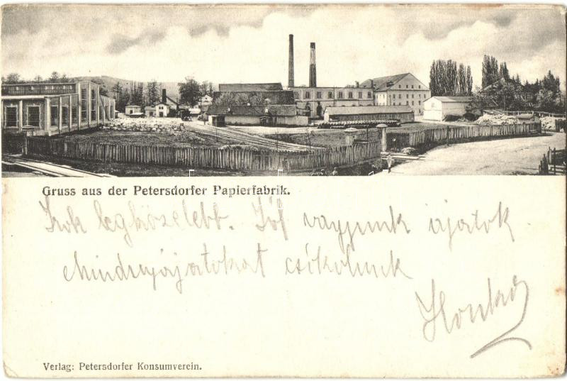 Péterfalva, Petersdorf, Petresti; Papírgyár, fogyasztási szövetkezet k... https://www.darabanth.com/de/294-Fernauktion/294.0/Ansichtskarten/Siebenburgen~100006/Peterfalva-Petersdorf-Petresti-Papirgyar-fogyasztasi-szovetkezet-kiadasa-paper-factory-~II1441066