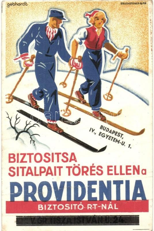 Beschreibung: Providentia Biztosító Rt. reklám, síelő pár. Bruchsteiner és fia / Hungarian insurance company's advertisement. Skiing couple, winter sport s: Gebhardt