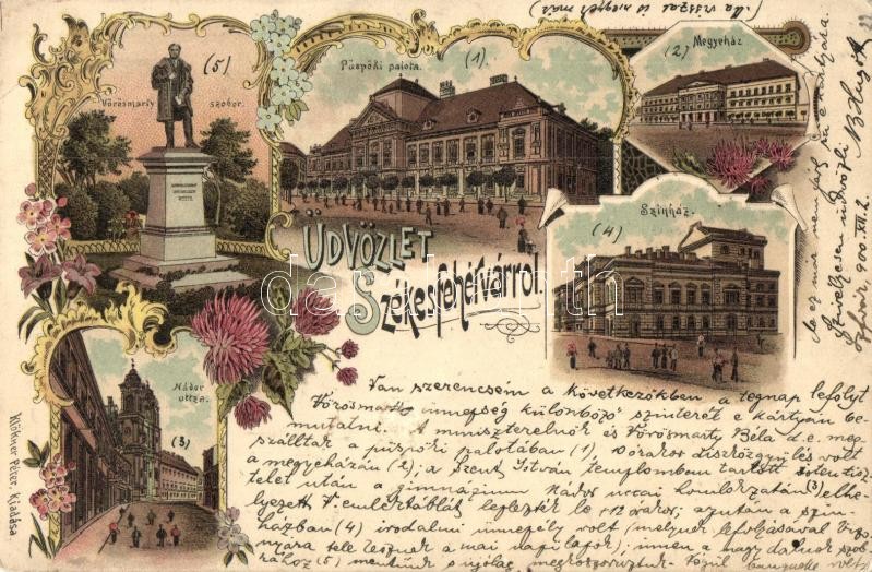 Beschreibung: Székesfehérvár, Vörösmarty szobor, püspöki palota, megyeház, színház, Nádor utca, Köhler Péter kiadása, floral Art Nouveau litho (EB)