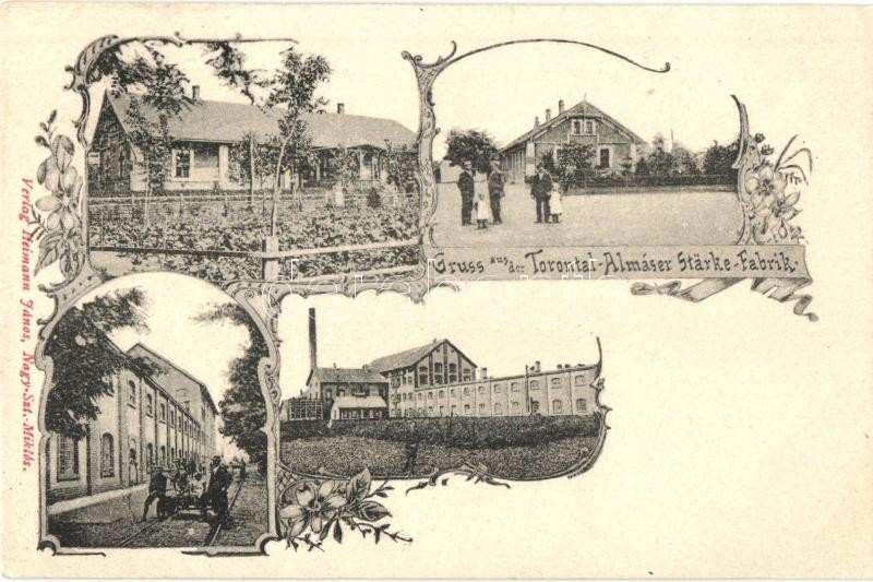 Beschreibung: Torontálalmás, Jabuka, Apfeldorf; vasútállomás hajtánnyal, malom, Keményítőgyár. Heimann János kiadása / railway station with handcair, mill, starch factory. Art. Nouveau floral