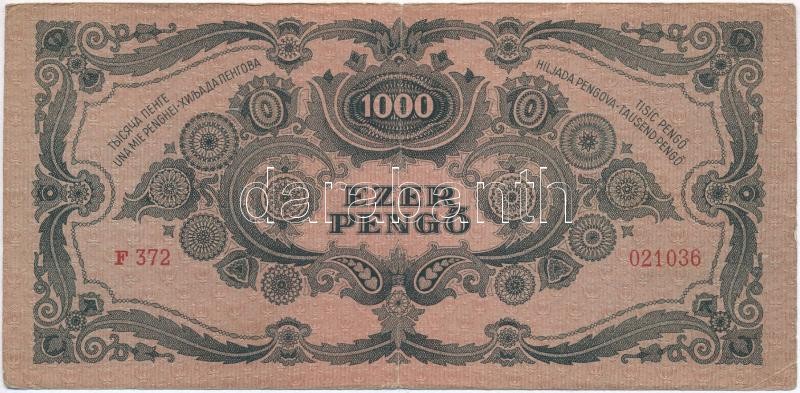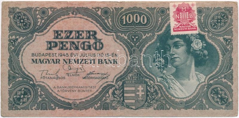 1945. 1000P betűhibás, élénk színű "MNB" bélyeggel T:III https://www.darabanth.com/de/294-Fernauktion/294.0/Numismatik/Ungarische-Banknoten~400007/1945-1000P-betuhibas-elenk-szinu-MNB-belyeggel-TIII~II1560241