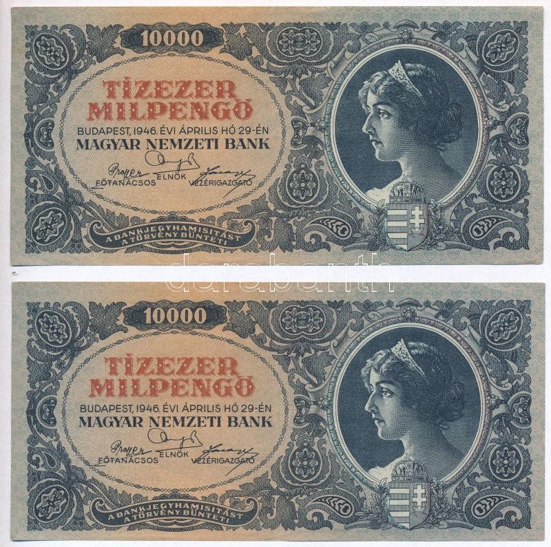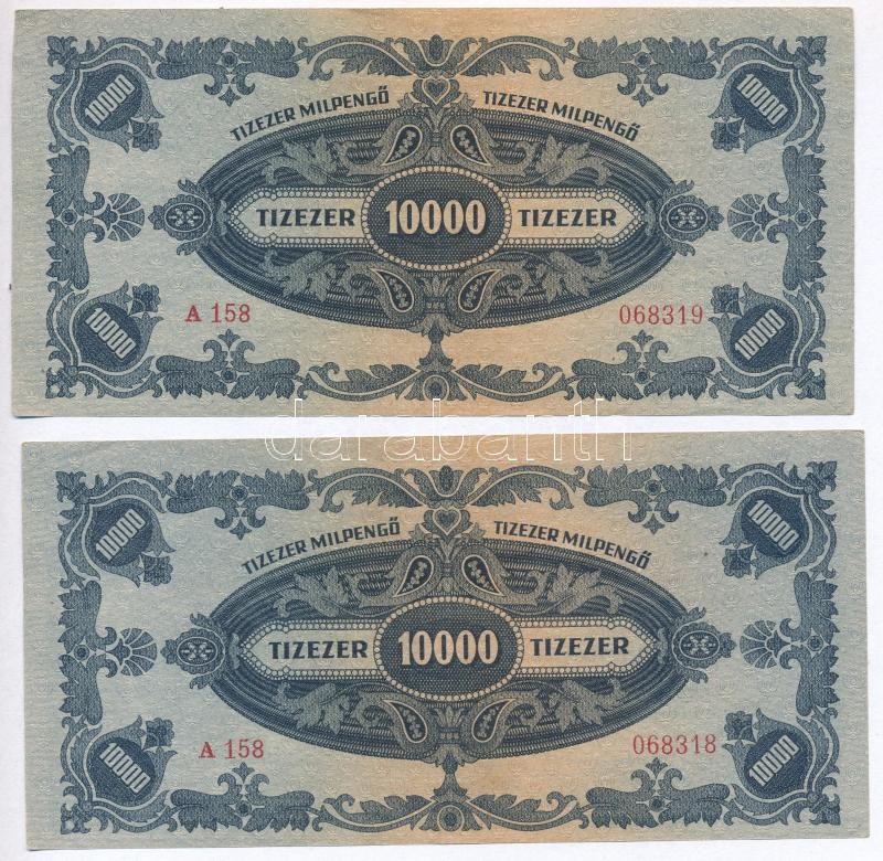 1946. 10.000MP (2x) sorszámkövetők T:II https://www.darabanth.com/de/294-Fernauktion/294.0/Numismatik/Ungarische-Banknoten~400007/1946-10000MP-2x-sorszamkovetok-TII~II1558112