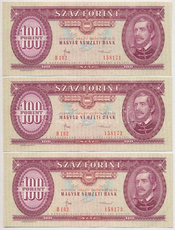 1984. 100Ft (3x) sorszámkövetők T:II https://www.darabanth.com/de/294-Fernauktion/294.0/Numismatik/Ungarische-Banknoten~400007/1984-100Ft-3x-sorszamkovetok-TII~II1559098