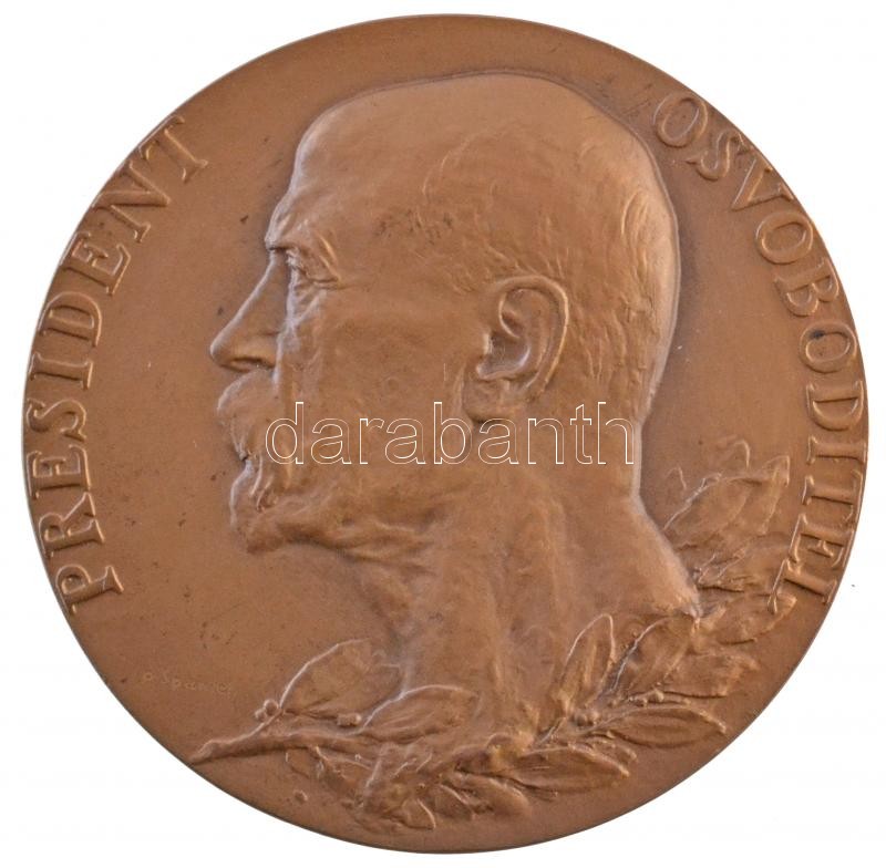 Csehszlovákia ~1940. "President Osvoboditel / In memoriam MCMXXXVII" T. G. Masaryk portréját ábrázoló jelzett Br plakett, peremén "MINCOVNA KREMNICA" jelzéssel. Szign.: O. Spaniel (1881-1955) (59mm) T:2