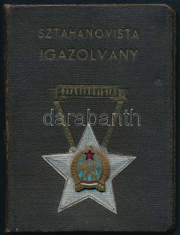 1954 Sztahanovista igazolvány, az előlapján fém jelvénnyel https://www.darabanth.com/de/295-Fernauktion/295.0/Andere-Sammelgebiete/Dokument~200018/1954-Sztahanovista-igazolvany-az-elolapjan-fem-jelvennyel~II1567660