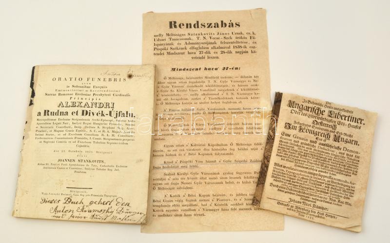 1688-1838 3 db régi nyomtatvány, sok szakadadással, körbevágva (Der in Römische Hofen ausgekleidete Ungarische Libertiner, Oratio funebris... Alexandri a Rudna et Divék-Újfalu, rendszabás)