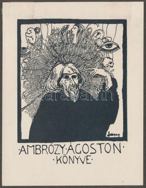 Beschreibung: Sassy Attila (Aiglon) (1880-1967): Ex libris Ambrózy Ágoston [író, 1914-1998], klisé, papír, jelzett a dúcon, 11,5×9 cm
