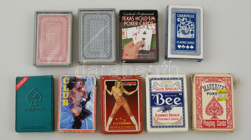 Beschreibung: 9 pakli francia kártya, eredeti dobozában (2 pakli erotikus)