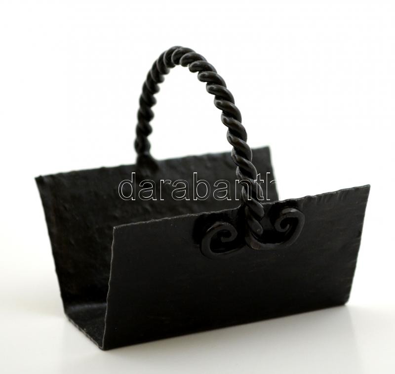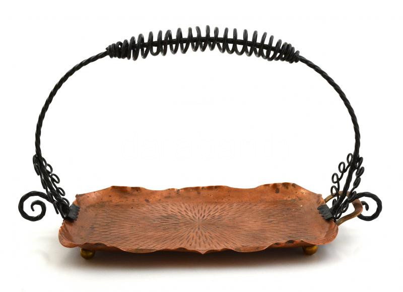 Beschreibung: Réz asztali kínálótálca kovácsoltvas fogóval, 30x15x20 cm + kovácsoltvas szalvétatartó, 7x6x7,5 cm