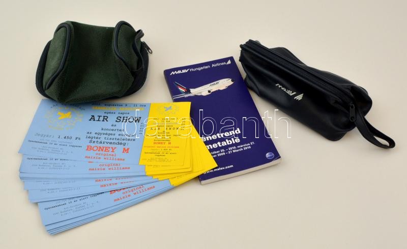 Beschreibung: Vegyes bolha tétel, MALÉV menetrend 2009-2010, MALÉV-os kistáska (benne fésű, ruha tisztító, kendő), kistáska, Sármellék Repülőtér Air Show 2003 belépőjegyek (15 db).