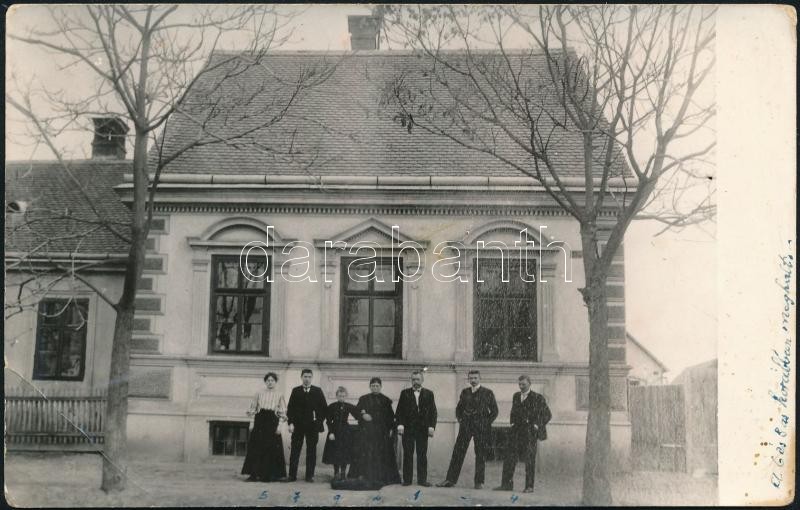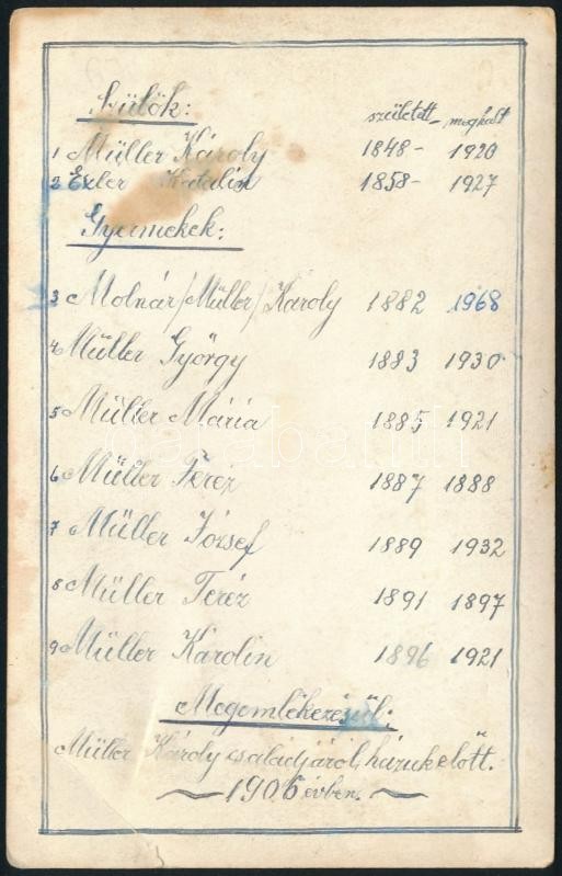 1906 Müller Károly (1848-1920) és családja házuk előtt, fotó, a fotó hátoldalán a családtagok neveivel, és születési, halálozási évükkel feliratozva, 9x14 cm.