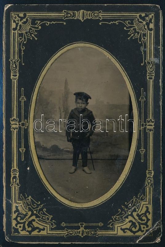 cca 1880-1890 Gyermekfotó, ferrotípia, Bp., Horváth Zsigmond, viseltes, szakadt, papír paszpartuban, 8,5x5,5 cm.