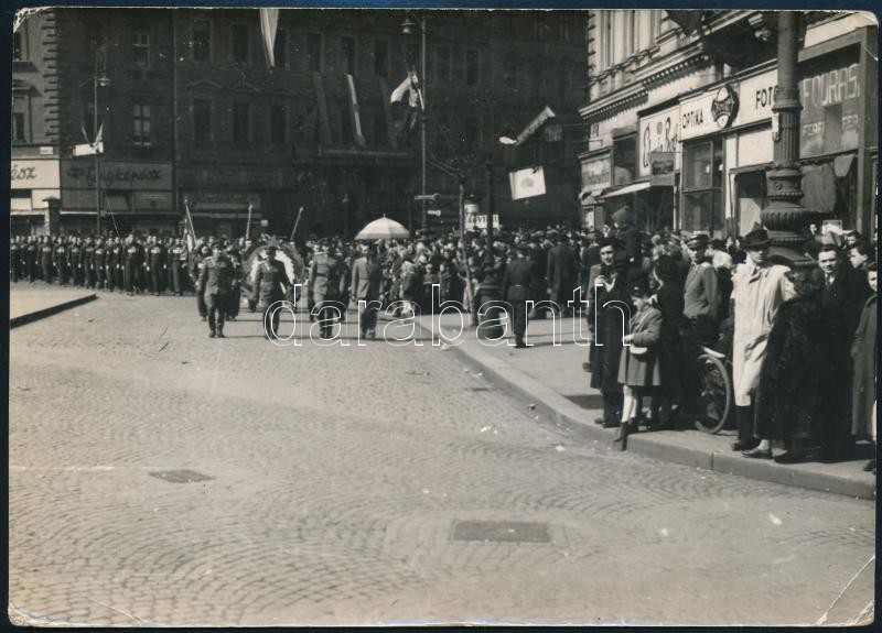Beschreibung: cca 1950 Honvéd sportolók az Oktogonnál, fotó, 13×18,5 cm