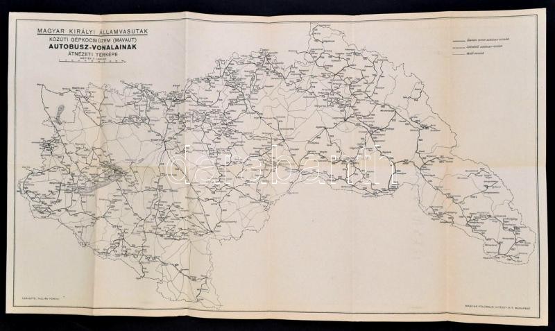 1941 Tallián Ferenc: A Magyar Királyi Államvasutak közúti gépkocsiüzem (MÁVAUT) autóbuszvonalainak átnézeti térképe és vasúti hálózati térképe, két oldalas térkép, Magyar Földrajzi Intézet Rt. 58x33 cm