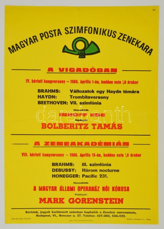 1986 Magyar Posta Szimfonikus Zenekar előadásainak plakátja, hajtott, ... https://www.darabanth.com/de/295-Fernauktion/295.0/Andere-Sammelgebiete/Poster~200031/1986-Magyar-Posta-Szimfonikus-Zenekar-eloadasainak-plakatja-hajtott-67-5x48-cm~II1567305