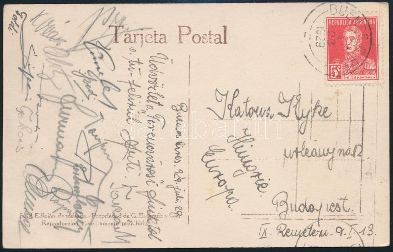 1929 A Ferencváros labdarúgó csapatának uruguayi útjáról küldött képeslap a játékosok (pl.: Toldi, Lázár, Takács stb...) aláírásával. /