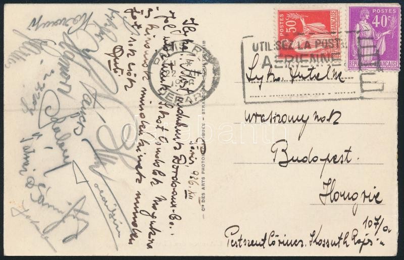 1936 A Ferencváros labdarúgó csapatának párisi útjáról küldött képeslap a játékosok (pl.: Szalai, Tátrai, Lyka stb...) aláírásával. /