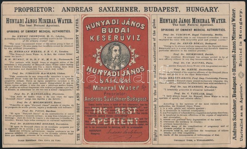 cca 1910-1930 Hunyadi János Natural Mineral Water, Andreas Saxlehner Budapest, drinklabel, in English language, 23x14 cm.