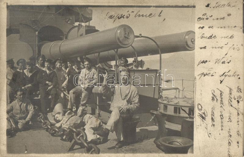 1906 Cseh matrózok valószínűleg osztrák-magyar hadihajó fedélzetén, löveggel / Czech mariners on board of a K.u.K. Kriegsmarine warship with cannon, photo (ragasztónyom / gluemark)