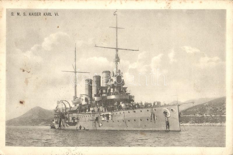 SMS Kaiser Karl VI. az Osztrák-Magyar Monarchia haditengerészetének VI. Károly-osztályú páncélos cirkálója / K.u.K. Kriegsmarine Panzerkreuzer, Austro-Hungarian Navy armored cruiser, Phot. A. Beer, Verlag F. W. Schrinner, Pola. 'K.u.K. Kriegsmarine SMS Árpád' Marinefeldpost (EK)