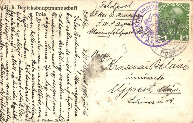 Beschreibung: Pola, K. k. Bezirkshauptmannschaft / Austro-Hungarian municipal district office, Verlag A. Fischer Nr. 517. 'K.u.K. Kriegsmarine SMS Árpád' Marinefeldpost (EK)