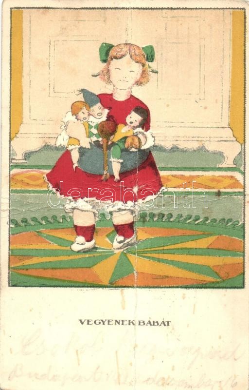 Beschreibung: Vegyenek babát! Egy jó kislány viselt dolgai. Képeslapsorozat, rajzolta Kozma Lajos / Hungarian art postcard, girl with dolls s: Kozma Lajos (fa)