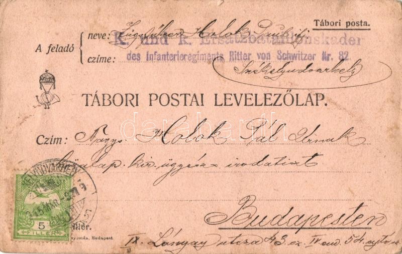 1915 'Die Impfung gegen Tifus' / 'Védőoltás tífusz ellen' / Első világháborús eredeti kézzel rajzolt K.u.K. tábori lap, karikatúra / 'The vaccination against typhus' WWI K.u.K. original hand-drawn military field post, caricature 'K.u.K. Ersatzbataillonskader des Infanterieregiments. Ritter von Schwitzer Nr. 82.' s: Halak Pál (kis szakadás / small tear)