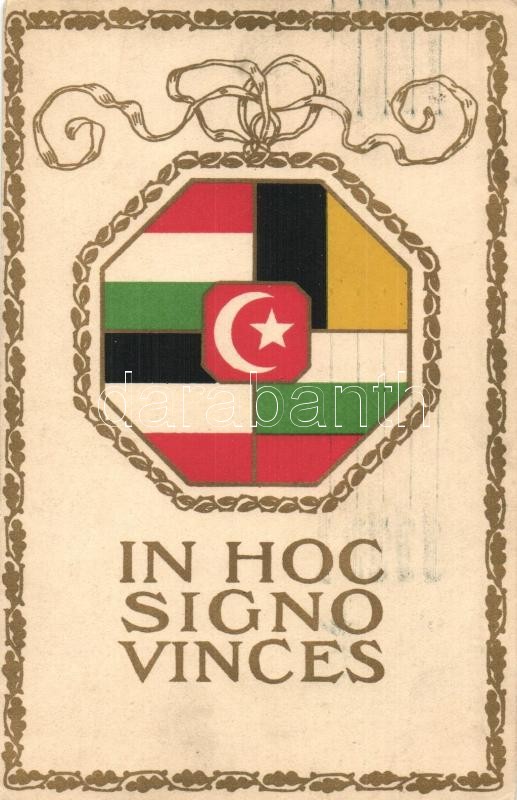 In Hoc Signo Vinces. Központi hatalmak propagandalap. Rigler József Ede kiadása / In this sign you will conquer, Central Powers propaganda card, golden Art Nouveau