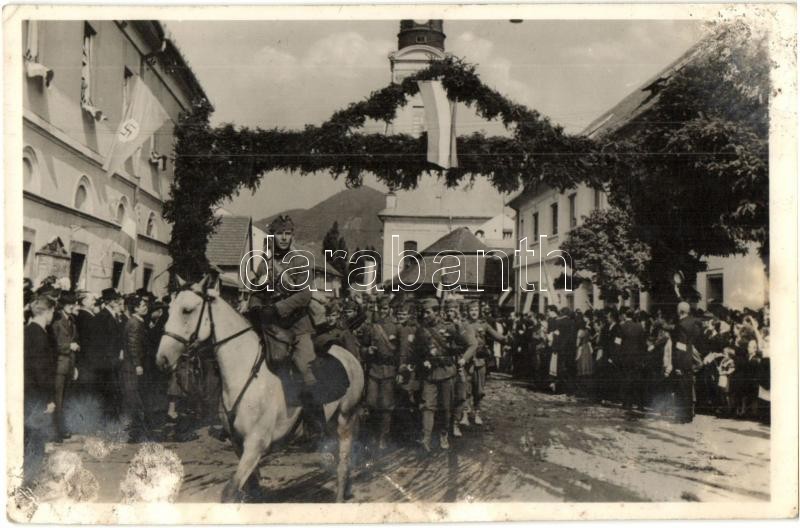 Beschreibung: 1940 Nagybánya, Baia Mare; bevonulás, szvasztika zászló / entry of the Hungarian troops, swastika falg, "1940 Nagybánya visszatért" So. Stpl (felszíni sérülés / surface damage)