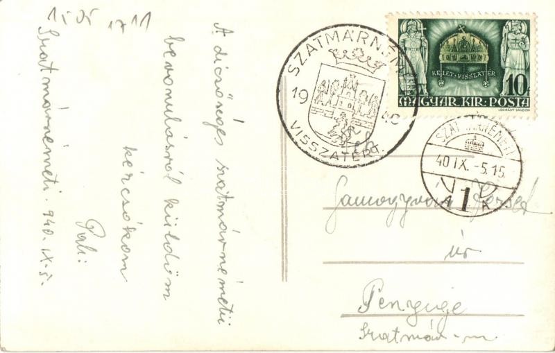 1940 Szatmárnémeti, Satu Mare; Horthy Miklós, Katolikus főgimnázium és székesegyház, Pannonia szálló, református templom és főgimnázium. Foto Kósa / grammar school, cathedral, hotel "1940 Szatmárnémeti visszatért" So. Stpl
