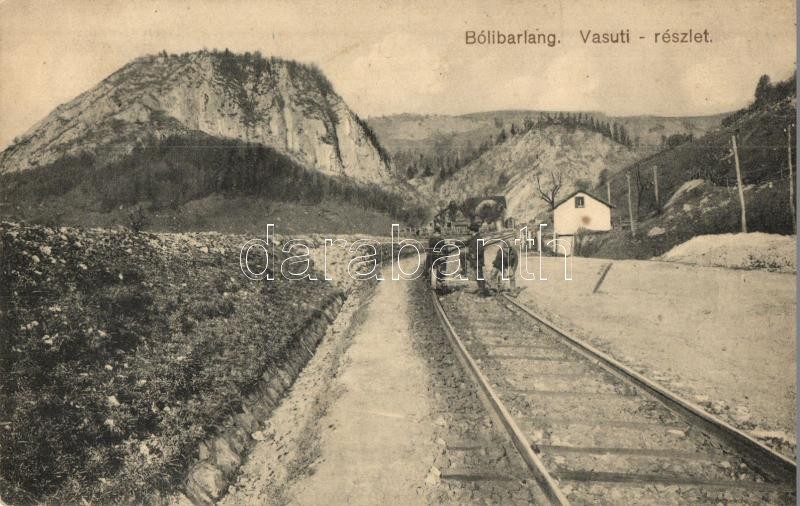 Beschreibung: Petrozsény, Petrosani; Boli barlang-i vasútállomás hajtánnyal. Adler fényirda / railway station, hand car