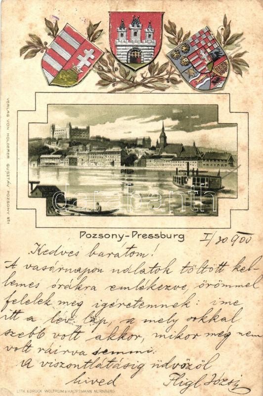 Beschreibung: 1900 Pozsony, Pressburg, Bratislava; címerek, kiadja Holderer Gusztáv No. 3. / promenade, coat of arms, Emb. litho s: Max Trübe (fa)