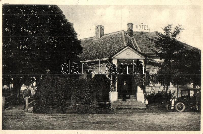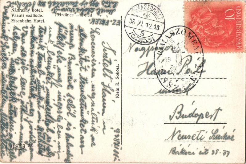 Feled, Veladin, Jesenské; Nadrazny hotel / Vasúti szálloda, automobil, Klein R. kiadása / Eisenbahn Hotel / railway hotel, automobile, '1938 Rimaszombat visszatért' So. Stpl. (EB)