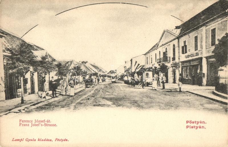 Beschreibung: Pöstyén, Piestany; Ferenc József út, Fürdő szálloda, üzletek, Lampl Gyula kiadása / street view, spa hotel, shops (EB)