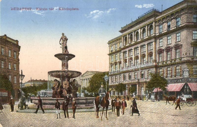 Beschreibung: Budapest VIII. Kálvin tér, gyógyszertár, Pesti hazai első takarékpénztár egyesület, Tokaji China vasbor üzlet, villamos, szökőkút
