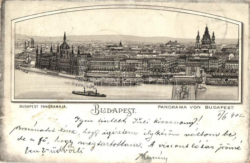 Beschreibung: Budapest, panoráma, gőzhajó, Lánchíd, Országház, litho (EK)