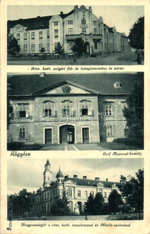 Hőgyész, Római katolikus polgári fiú- és leányinternátus és zárda, Gróf Apponyi kastély, nagyvendéglő a római katolikus templommal és Hősök szobrával, Neuvelt-foto kiadása (EK)