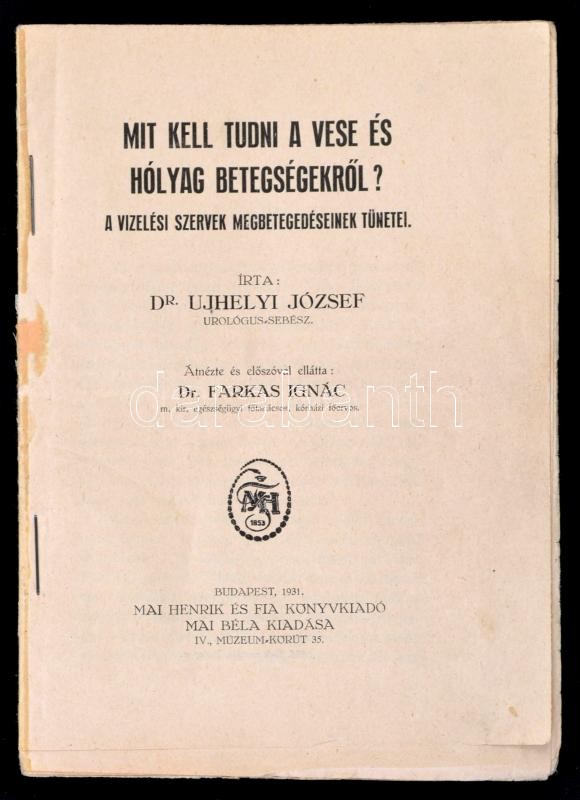 Dr. Ujhelyi József: Mit kell tudni a vese és hólyag betegségekről? A vizelési szervek megbetegedéseinek tünetei. Előszót írta Dr. Farkas Ignác. Bp., 1931, Mai Henrik és Fia Könyvkiadó, 32 p. Tűzött kötés.