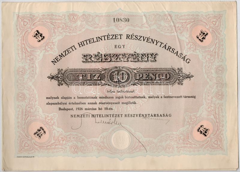 Budapest 1926. "Nemzeti Hitelintézet Részvénytársaság" részv... https://www.darabanth.com/de/295-Fernauktion/295.0/Numismatik/Aktien-und-Tickets~400005/Budapest-1926-Nemzeti-Hitelintezet-Reszvenytarsasag-reszvenye-10P-rol-szarazpecsettel-~II1569012