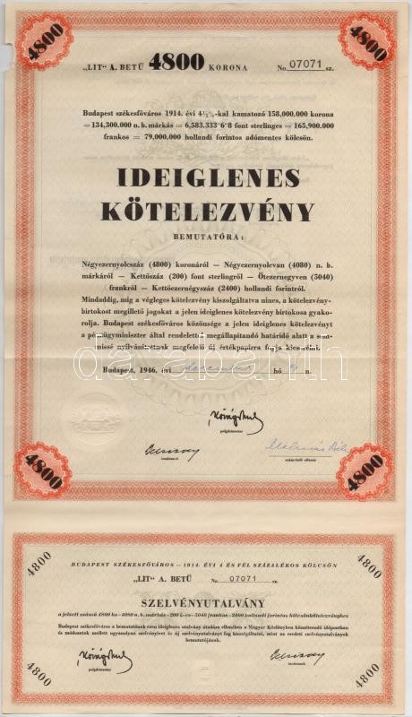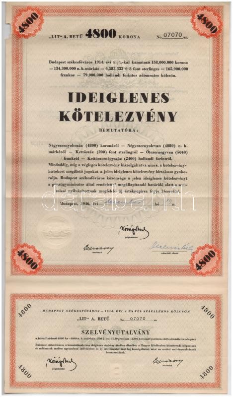 Beschreibung: Budapest 1946. "Budapest Székesfőváros 1914. évi 4 1/2%-kal kamatozó 158.000.000K adómentes kölcsön" ideiglenes kötelezvénye 4800K-ról, szárazpecséttel és szelvényutalvánnyal (2x) sorszámkövetők T:III