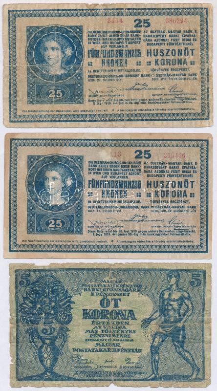 Beschreibung: 1918. 25K (2x) + 1919. 5K (2x) "MÁS TÖRVÉNYES..." + 1919. 10K T:III-,IV