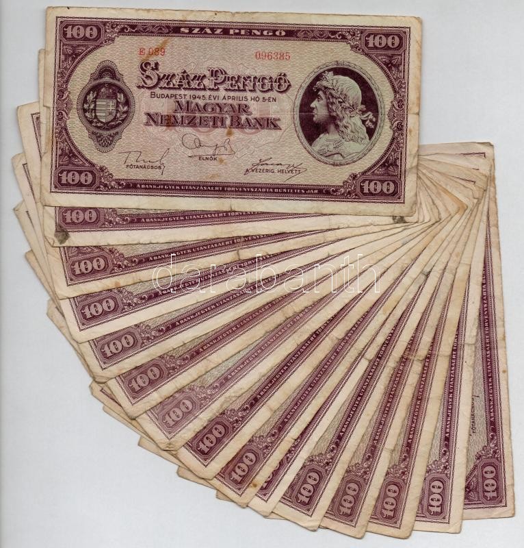 1945. 100P (15x) T:III,III- https://www.darabanth.com/de/295-Fernauktion/295.0/Numismatik/Ungarische-Banknoten~400007/1945-100P-15x-TIII-III-~II1566773