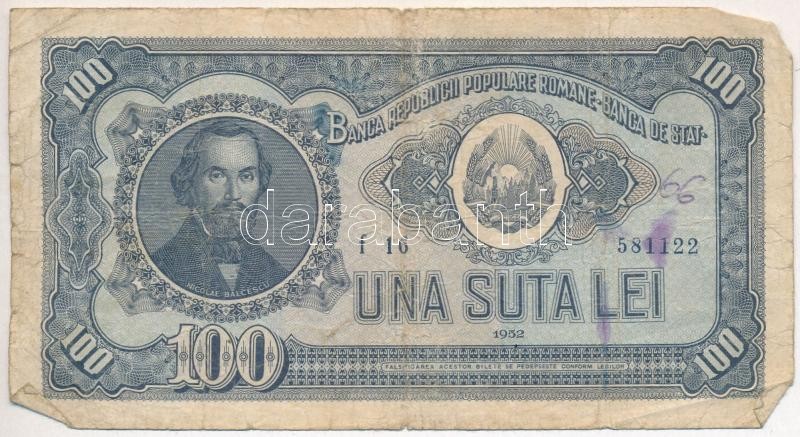Romania 1952. 100 Lei C:VG https://www.darabanth.com/de/295-Fernauktion/295.0/Numismatik/Weltweit-Banknoten~400012/Romania-1952-100L-TIII---Romania-1952-100-Lei-CVG~II1567837