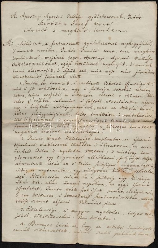 1838 Michalkó János, az apostagi evangélikus gyülekezet lelkipásztorának meghívója Szirótka József tanító részére az evangélikus gyülekezet oktatójának, mellékelve az evangélikus tanító jövedelmeinek éves felsorolásával